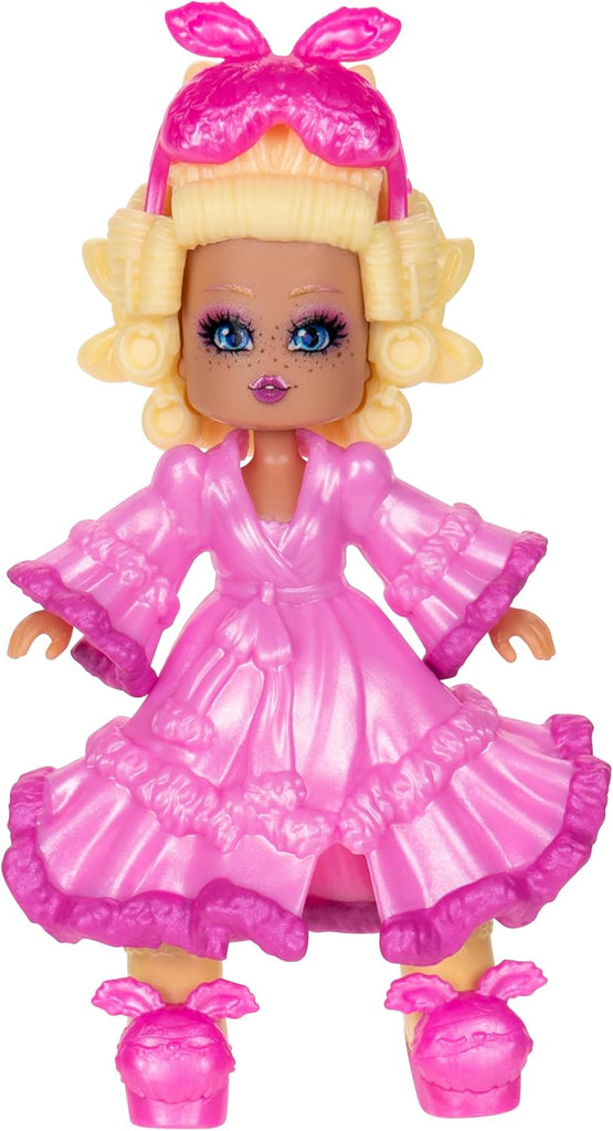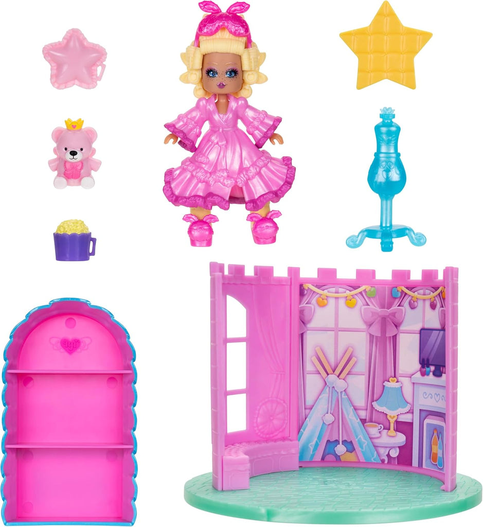 - DORM ROOM PLAYSET The 3" doll includes a 2-in-1 bed/bookshelf, 2-in-1 ottoman/storage, a mannequin, a star pillow, a teddy bear, and popcorn