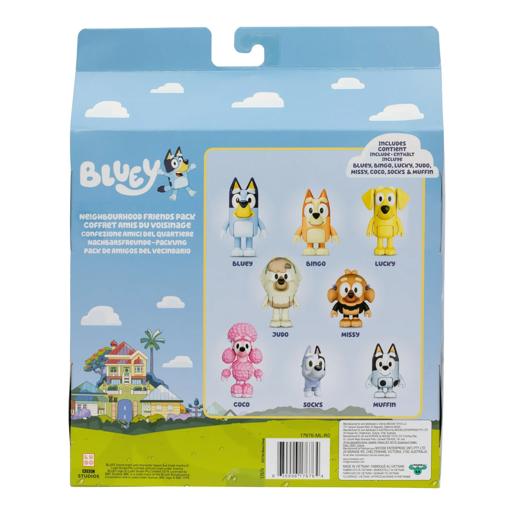 - Complete Set: Bluey "Neighbourhood Friends Pack" includes 8 figures: Bluey, Bingo, Lucky, Coco, Socks, Muffin, Judo, and Missy.